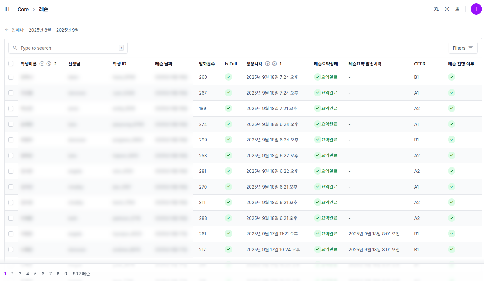 화상 영어 레슨 내용을 자동 녹취 및 요약해 학습 현황을 직관적으로 확인하고, 레슨이 끝나면 바로 개인별 요약 피드백을 카카오톡으로 받아볼 수 있게 했습니다. 실제 서비스 도입 후 운영 효율이 크게 향상되었습니다.